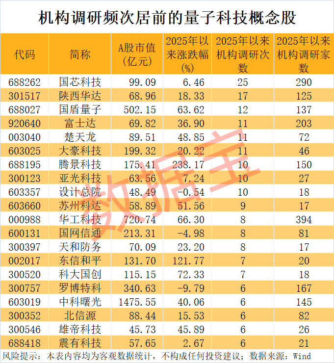 据证券时报·数据宝统计,今年以来量子科技概念股合计获得313次机构调研。 国芯科技 、 陕西华达 、 国盾量子 、 富士达 、 楚天龙 、 大豪科技 6只概念股调研频次在11次及以上,相当于月均至少调研1次。