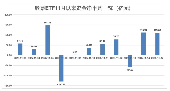 据银河证券基金研究中心数据统计,11月17日,全市场股票ETF(含跨境ETF)资金净流入接近110亿元,这也是股票ETF市场连续两个交易日出现百亿元资金净流入。