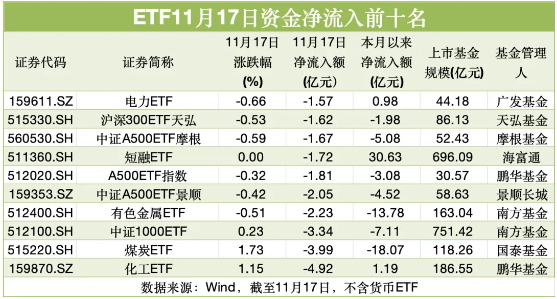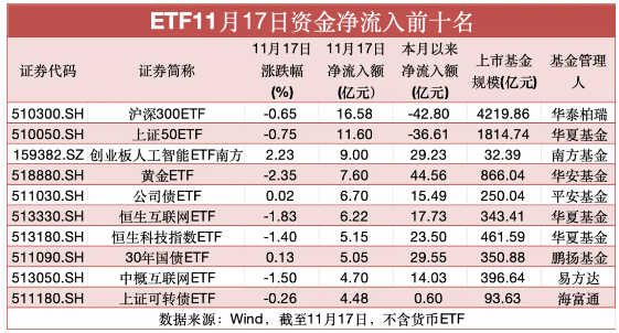 据Wind数据统计,11月17日, 华泰柏瑞沪深300ETF 、 华夏上证50ETF 资金净流入分别在全市场非货ETF中排名第一、第二,净流入金额分别为16.58亿元、11.6亿元。
