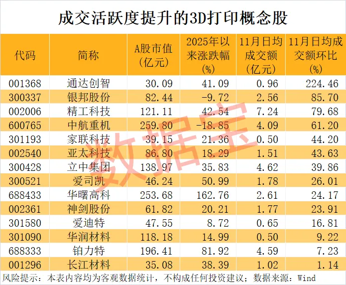 从成交情况来看,11月以来日均成交额环比增长的3D概念股有14只。 通达创智 环比增幅最高,该股11月以来日均成交0.96亿元,环比涨幅为224.46%。公司曾在投资者互动平台表示,公司已取得“一种3D打印高效冷却异形水路的模具结构”“一种薄壁水杯嫁接式3D打印模仁的模具”“一种3D螺旋水路即热式加热系统”等多项专利技术。目前,在多个场景有应用到3D打印相关技术。