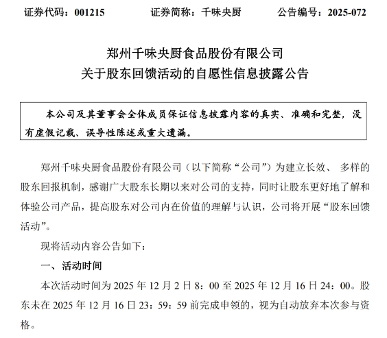 与 峨眉山A 不同,千味央厨的回馈股东活动,仅限于12月1日收盘前的持股股东,而峨眉山是2025年12月1日至2026年1月31日,持500股以上股东可免景区、索道门票。