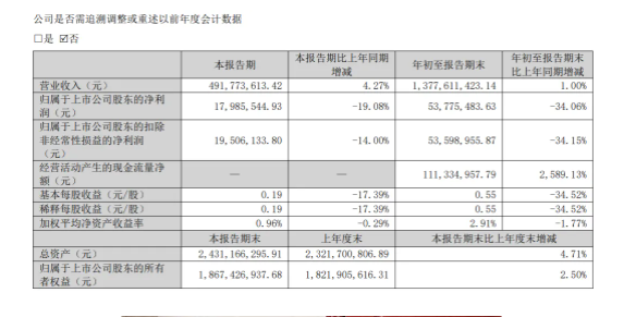 前三季度累计归母净利润为5377.55万元,同比大幅下滑34.06%;扣非后归母净利润为5359.9万元,同比下降34.15%。