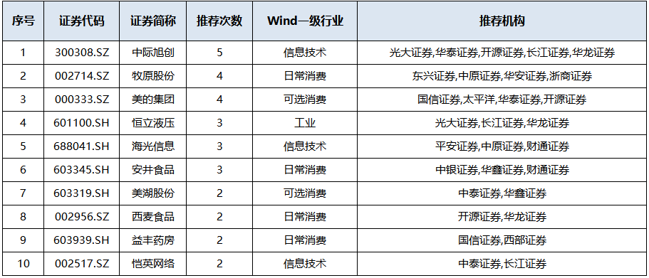牧原股份、美的集团同时获得4家券商推荐。其中, 国信证券 认为美的集团具备完善的激励机制和强大的组织执行力,研发体系、规模化生产、渠道网络优势明显,有望推动公司B2B和B2C业务的持续发展。 浙商证券 则认为牧原股份在猪价低位运行的状态下,超额盈利持续性会强于市场预期。