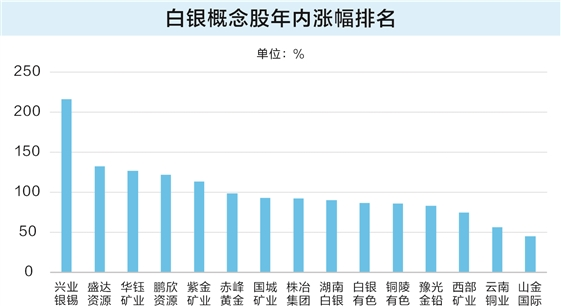 据证券时报·数据宝统计,截至12月8日收盘,今年以来白银概念股平均上涨78.12%,远远跑赢同期上证指数。 兴业银锡 、 盛达资源 、 华钰矿业 、 鹏欣资源 等5只概念股年内涨幅翻倍。