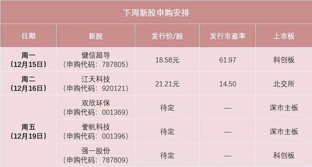 从日程安排看,周一(12月15日)可申购科创板新股健信超导,周二(12月16日)可申购北交所新股江天科技,周五(12月19日)可申购深市主板新股双欣环保、深市主板新股誉帆科技、科创板新股强一股份。