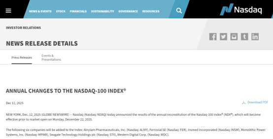 将被纳入纳斯达克100指数的六家公司分别为:阿尔尼拉姆制药(Alnylam Pharmaceuticals)、法罗里奥集团(Ferrovial)、因斯梅德公司(Insmed)、芯源系统(Monolithic Power Systems)、希捷科技(Seagate)和 西部数据 (Western Digital)。