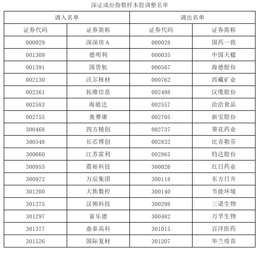 其中,深证成指样本股调入 德明利 、 沃尔核材 、 拓维信息 、 四方精创 、 长芯博创 、 大族数控 等,调出 国药一致 、 中国天楹 、 海德股份 、 西藏矿业 、 洽洽食品 、 新宝股份 等。