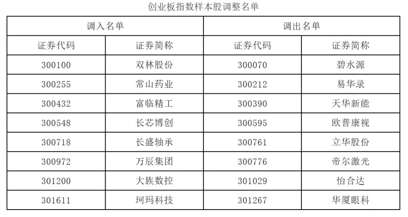 创业板指样本股调入 双林股份 、 常山药业 、 富临精工 、长芯博创、 长盛轴承 、 万辰集团 、大族数控、 珂玛科技 ;调出 碧水源 、 易华录 、 天华新能 、 欧普康视 、 立华股份 、 帝尔激光 、 怡合达 、 华厦眼科 。