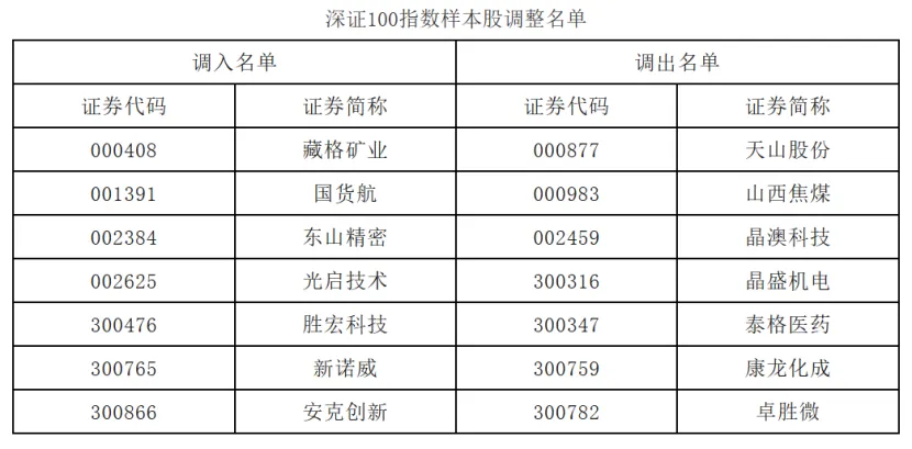 深证100指数样本股调入 藏格矿业 、 国货航 、 东山精密 、 光启技术 、 胜宏科技 、 新诺威 、 安克创新 ;调出 天山股份 、 山西焦煤 、 晶澳科技 、 晶盛机电 、 泰格医药 、 康龙化成 、 卓胜微 等7只个股。