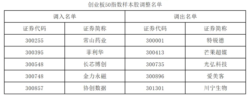 创业板50指数样本股调入常山药业、 菲利华 、长芯博创、 金力永磁 、 协创数据 ;调出 特锐德 、 芒果超媒 、 光弘科技 、 爱美客 、 川宁生物 。