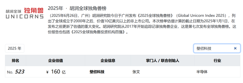 据2025年胡润百富独角兽排行榜,壁仞科技估值达160亿元,排名全球第523位。
