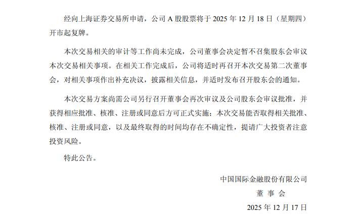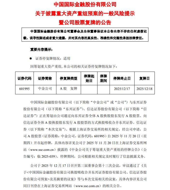 12月17日晚间, 中金公司 与 东兴证券 、 信达证券 同步披露重大资产重组预案,并拟于18日复牌。