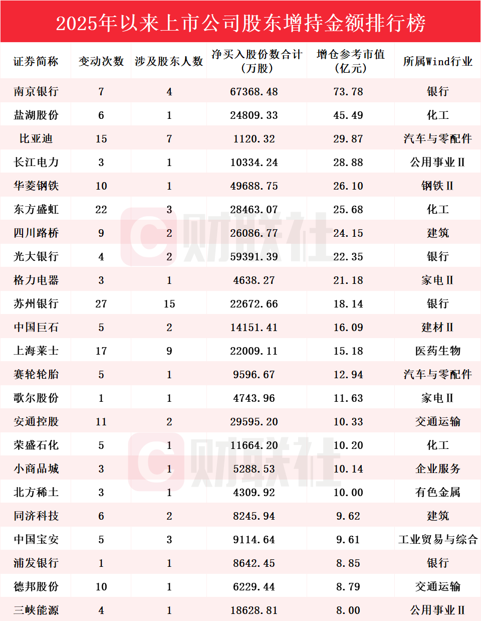 数据显示,总市值1411亿、主要产品是商业银行业务的南京银行年初迄今获股东增持金额总计73.78亿元。南京银行11月21日发布公告称,法国巴黎银行(QFII)在9月29日至11月20日期间,以自有资金增持南京银行股份约1.28亿股。此次增持后,法国巴黎银行及法国巴黎银行(QFII)合计持股比例由17.02%跃升至18.06%。南京银行12月17日公告称,公司拟于2025年12月23日全额赎回0.49亿股优先股“南银优1”。为保证公平信息披露,维护投资者利益,公司拟申请于2025年12月22日对本次优先股停牌,并于2025年12月23日对本次优先股赎回注销。