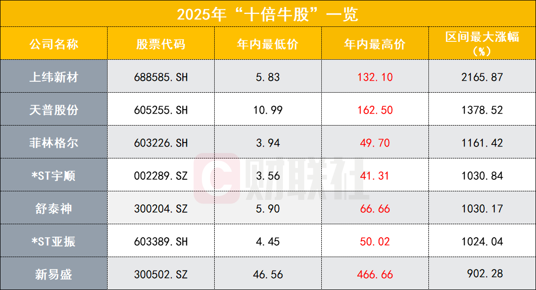 截至目前,2025年的A股市场,“十倍股”并非个例, 上纬新材 等多只个股也上演了类似的十倍行情。以下为财联社梳理的2025年“十倍牛股”: