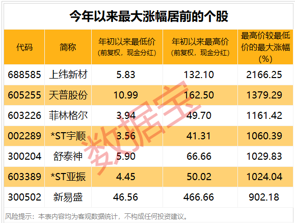 据证券时报·数据宝统计,以年初至今最低价与最高价计算, 上纬新材 、 天普股份 、 菲林格尔 、 *ST宇顺 、 舒泰神 、 *ST亚振 6股年初以来最高价为最低价的10倍以上。其中上纬新材涨幅最高,年内最高价132.1元/股,较最低价5.83元/股上涨2166.25%。