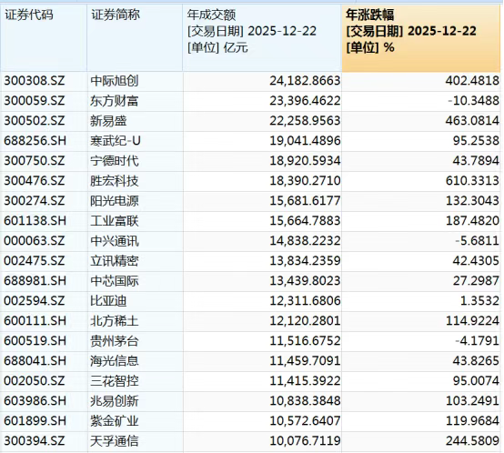 从个股来看,截至12月22日,19只股票今年以来成交额超1万亿元, 中际旭创 、 东方财富 、 新易盛 今年以来成交额均超2万亿元; 寒武纪 -U、 宁德时代 、 胜宏科技 今年以来成交额均超1.8万亿元; 阳光电源 、 工业富联 今年以来成交额均超1.5万亿元。