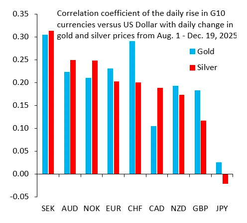 Brooks给出的下图显示了G10货币兑美元汇率的日变化,与黄金(蓝色)及白银(红色)价格的关联度。值得注意的是瑞典克朗——这种传统上波动剧烈且不具避险属性的货币,正因货币贬值交易而改变属性。