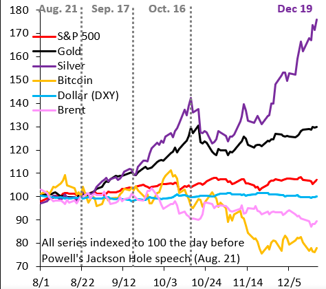 首先,此轮行情显然由美联储宽松政策及相关债务货币化担忧所触发。毕竟,美联储主席鲍威尔8月22日在杰克逊霍尔的鸽派讲话以及本月美联储最新的降息,都是贵金属起飞的重要催化剂。