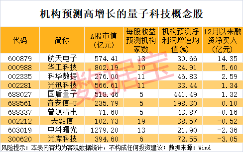 未来增长潜力方面,根据5家以上机构一致预测,2026年、2027年净利润增速均有望超20%的量子科技概念股有10只,如 中科曙光 、 华工科技 、 航天电子 、 光迅科技 、 国盾量子 等。