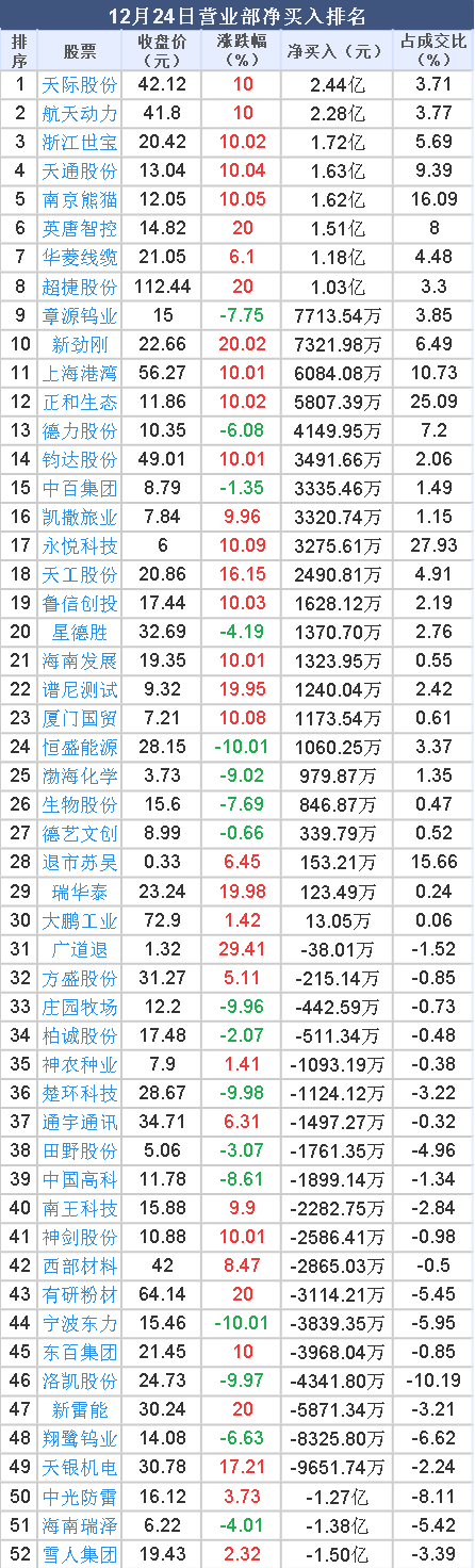 2025年12月24日, 大智慧 数据中心显示,龙虎榜中营业部净买入9.45亿元。其中,净买入的个股30只,营业部净买入较多个股分别是 天际股份 、 航天动力 、 浙江世宝 等,净买入金额占当日成交额比例达3.71%、3.77%、5.69%。