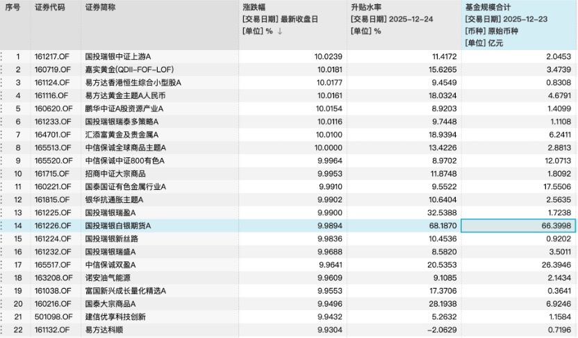 截至12月24日收盘,包括国投瑞银白银LOF、国投瑞银中证上游LOF、嘉实黄金QDII-FOF-LOF、易方达黄金主题A人民币LOF等20余只LOF在二级市场涨停。