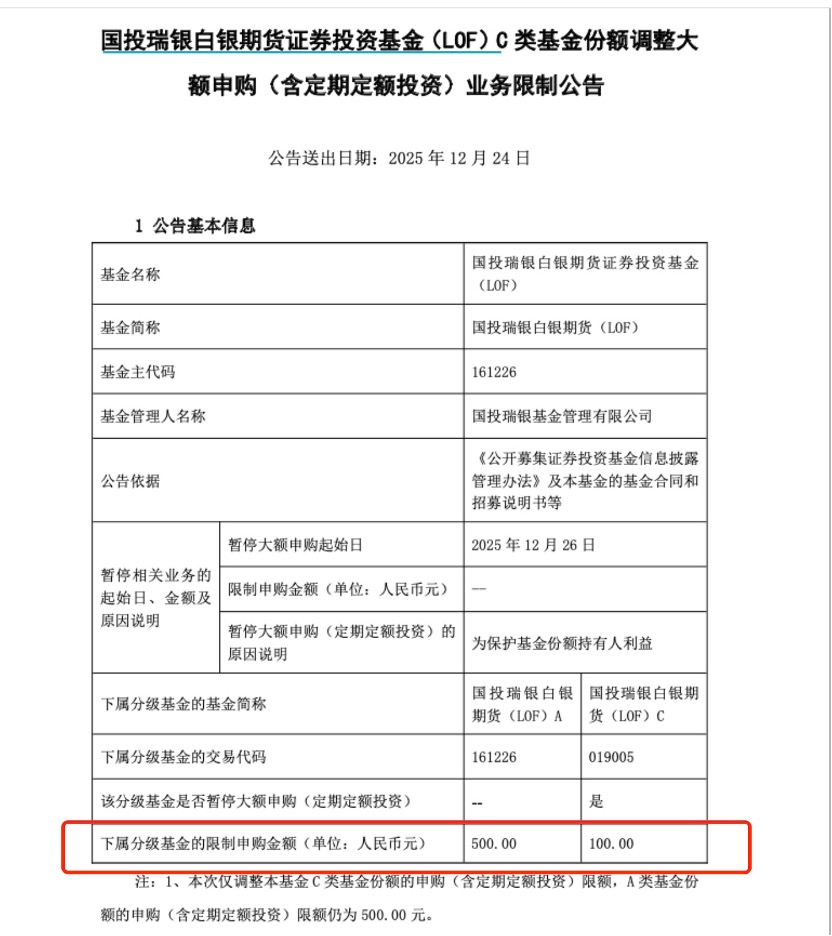 10月15日,国投白银LOF基金公告称,A类份额及C类份额的定期定额投资金额上限分别为6000元和40000元;10月20日,国投白银LOF基金再次发布公告,继续收紧了限购金额,A类份额及C类份额的定期定额投资金额上限分别为100元和1000元;12月19日,国投白银LOF基金发布公告,将A类份额及C类份额的定期定额投资金额上限分别调整为500元和500元。