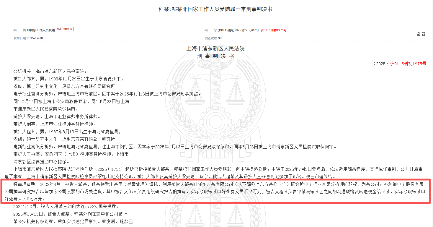 判决书未公布邹某具体信息,但相关研报信息直指东方财富证券原电子行业首席分析师邹杰。