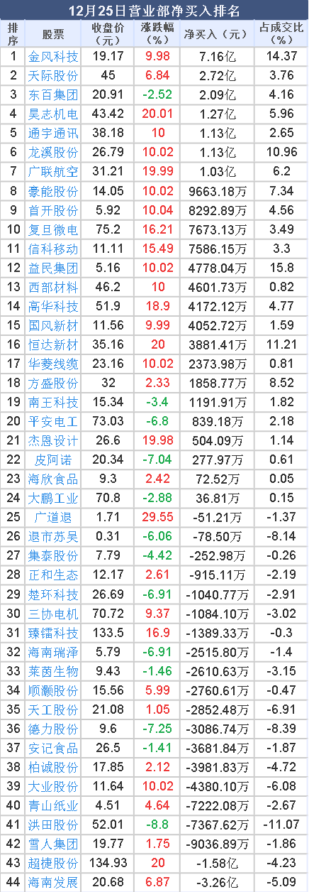 2025年12月25日, 大智慧 数据中心显示,龙虎榜中营业部净买入12.45亿元。其中,净买入的个股24只,营业部净买入较多个股分别是 金风科技 、 天际股份 、 东百集团 等,净买入金额占当日成交额比例达14.37%、3.76%、4.16%。