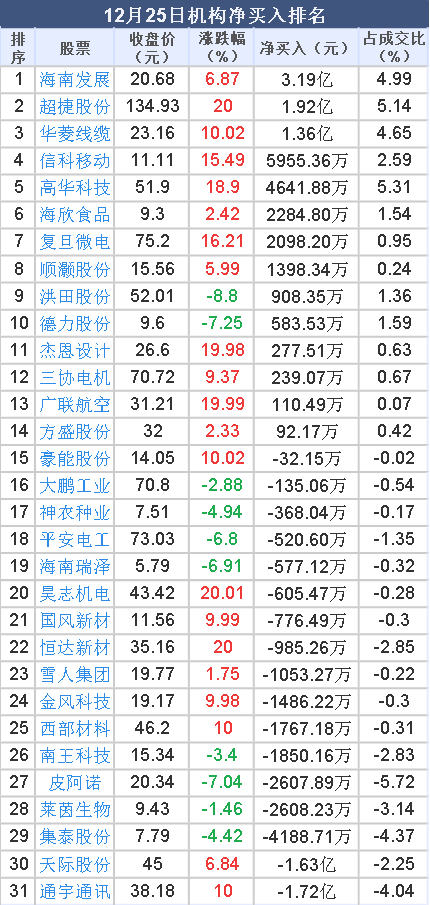 2025年12月25日,大智慧数据中心显示,龙虎榜中机构净买入1.12亿元。其中,净买入的个股14只,机构净买入较多个股分别是海南发展、超捷股份、 华菱线缆 等,净买入金额占当日成交额比例达4.99%、5.14%、4.65%。