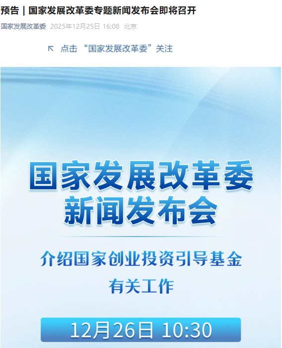 刚刚,国家发展改革委预告:国家发展改革委专题新闻发布会即将召开,介绍国家创业投资引导基金有关工作。