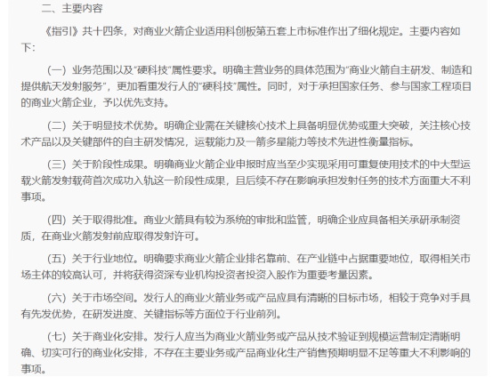 记者注意到,《指引》共14条,主要包括以下四方面:一是细化明显技术优势要求。明确主营业务为“商业火箭自主研发、制造及航天发射服务”,更加看重发行人的“硬科技”属性。要求企业需在拥有关键核心技术基础上具备明显技术优势或重大突破,关注核心技术产品以及关键部件的自主研发情况,以及运载能力及一箭多星能力等关键指标。对于承担国家任务、参与国家工程项目的商业火箭企业予以优先支持。