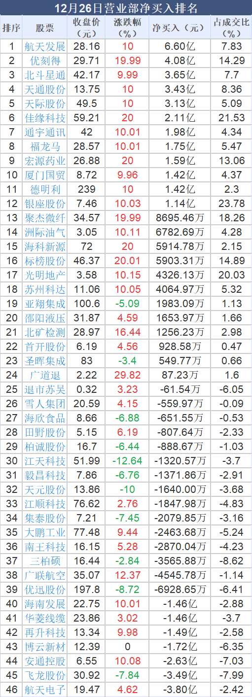 12月26日, 大智慧 数据中心显示,龙虎榜中营业部净买入17.28亿元。其中,净买入的个股24只,营业部净买入较多个股分别是 航天发展 、 优刻得 、 北斗星通 等,净买入金额占当日成交额比例达7.83%、14.29%、7.70%。
