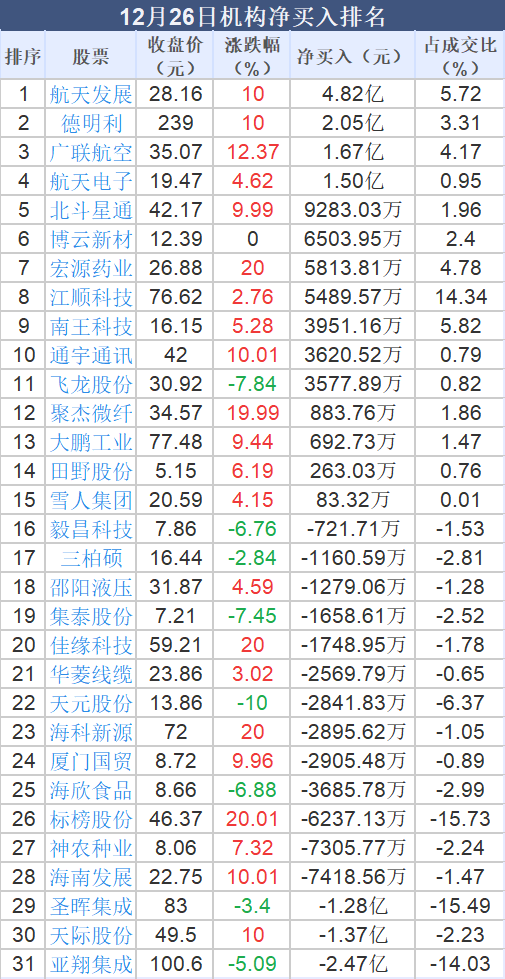 龙虎榜中机构净买入4.68亿元。其中,净买入的个股15只,机构净买入较多个股分别是航天发展、 德明利 、 广联航空 等,净买入金额占当日成交额比例达5.72%、3.31%、4.17%。