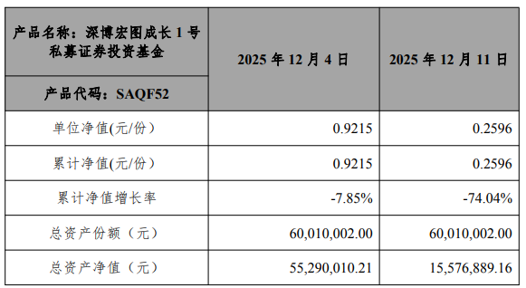 圣元环保在公告中表示,公司在2025年12月9日计划赎回基金全部份额,随后于12月12日收到基金管理人发送的净值表。根据公告披露的数据显示,该基金截至2025年12月4日的净值为0.9215元,然而,截至2025年12月11日,基金单位净值暴跌至0.2596元,累计亏损74.04%。也就是说,该基金在圣元环保提出计划赎回基金全部份额的当周,单周净值下跌了71.83%。