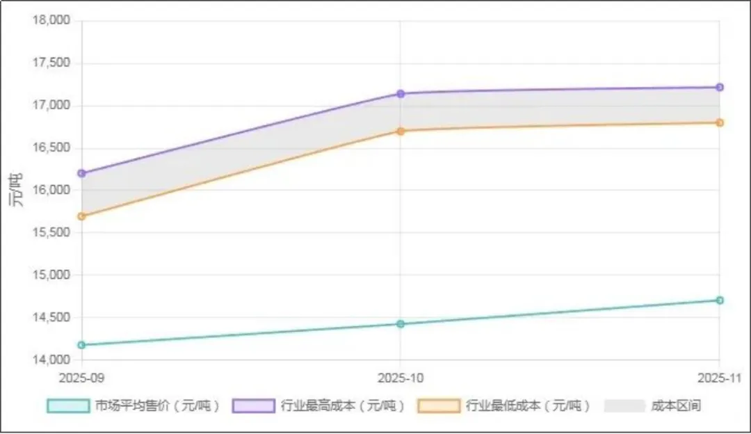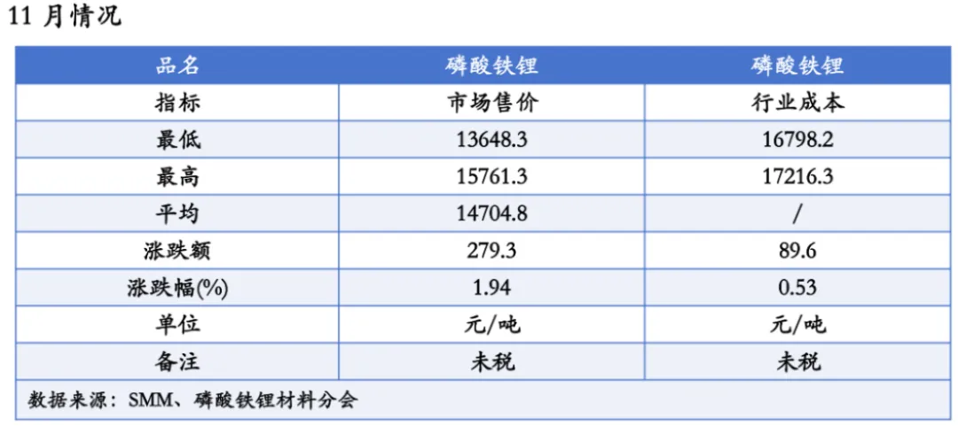 据 中国化学 与物理电源行业协会数据,11月磷酸铁锂市场售价平均为14704.8元/吨,行业成本则在16798.2元/吨至17216.3元/吨区间。