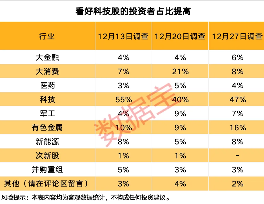 从板块来看,看好科技、 有色金属 板块的投资者比例大幅提高,分别均提高7个百分点。从具体概念来看,商业航天最被看好,占比达到35%,其次是算力、 小金属 、大消费,占比均超10%。