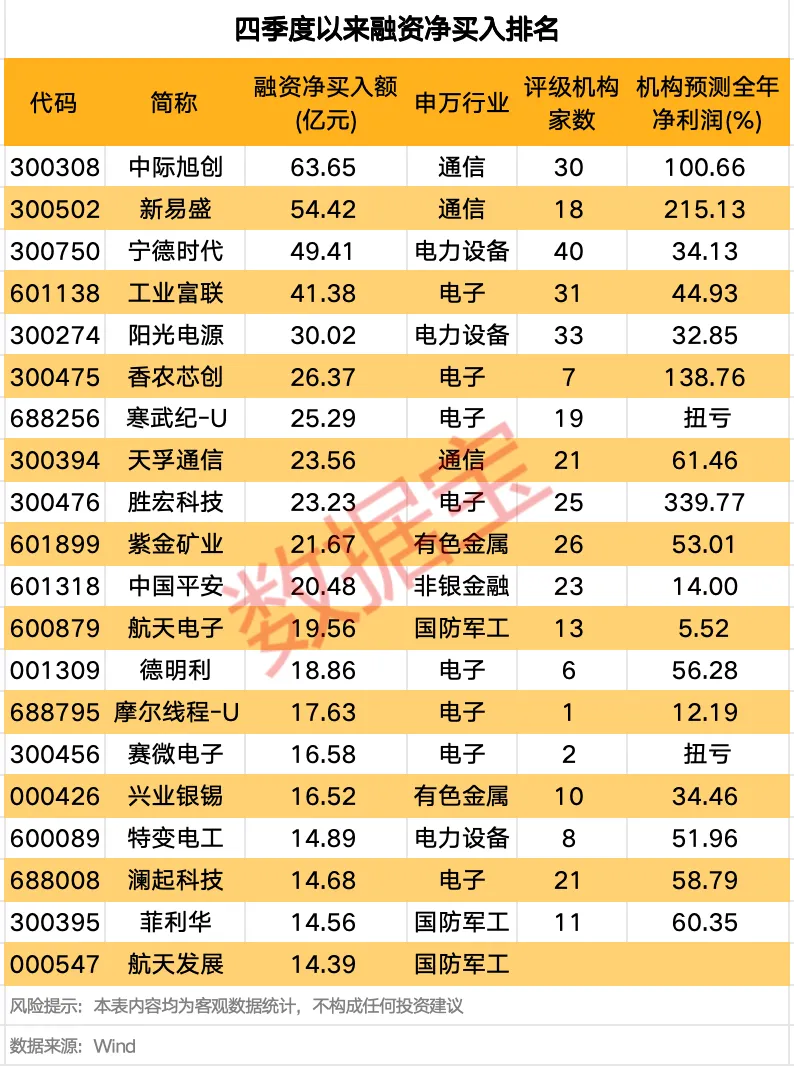 个股方面,32股四季度融资净买入额在10亿元以上。 中际旭创 、 新易盛 、 宁德时代 、 工业富联 、 阳光电源 排名前五,依次为63.65亿元、54.42亿元、49.41亿元、41.38亿元、30.02亿元; 香农芯创 、 寒武纪 -U、 天孚通信 、 胜宏科技 等6股随后,净买入额均在20亿元以上。
