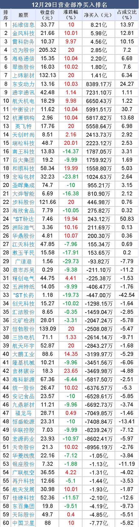 2025年12月29日, 大智慧 数据中心显示,龙虎榜中营业部净卖出2.36亿元。其中,净买入的个股28只,营业部净买入较多个股分别是 拓维信息 、 金风科技 、 雷科防务 等,净买入金额占当日成交额比例达13.97%、12.81%、10.15%。
