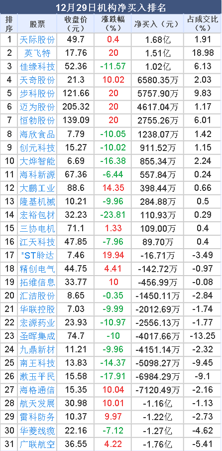 2025年12月29日,大智慧数据中心显示,龙虎榜中机构净卖出9.56亿元。其中,净买入的个股16只,机构净买入较多个股分别是天际股份、 英飞特 、 佳缘科技 等,净买入金额占当日成交额比例达1.91%、18.98%、6.13%。