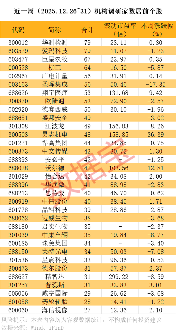近一周机构调研个股有200多只, 华测检测 调研机构数最多。
