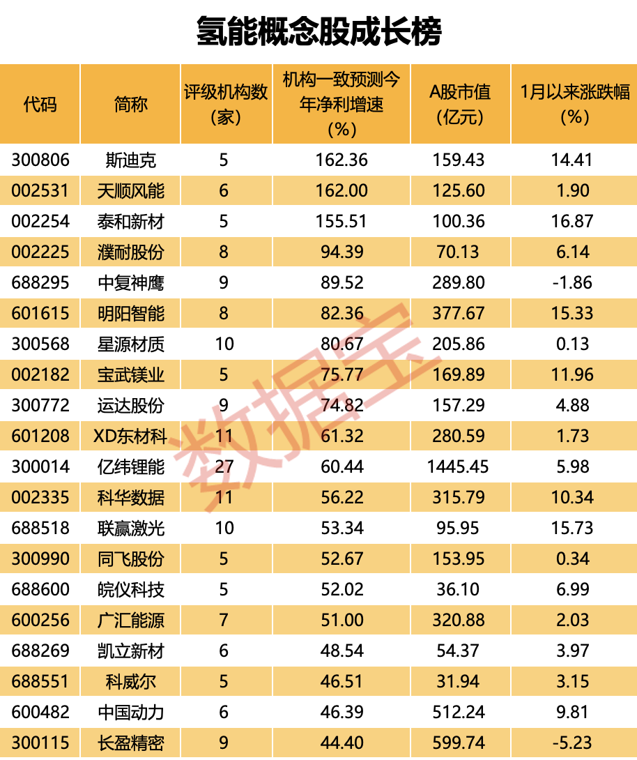 据证券时报·数据宝统计,A股市场上,氢能概念股合计有370多只。其中, 阳光电源 、 长城汽车 、 宝丰能源 、 长安汽车 等均有30家以上机构评级, 银轮股份 、 亿纬锂能 、 卫星化学 、 紫金矿业 等均有10家以上机构评级。