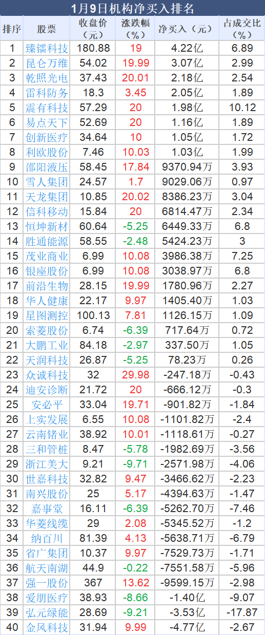 龙虎榜中机构净买入7.10亿元。其中,净买入的个股22只,机构净买入较多个股分别是 臻镭科技 、昆仑万维、 乾照光电 等,净买入金额占当日成交额比例达6.89%、2.99%、2.54%。