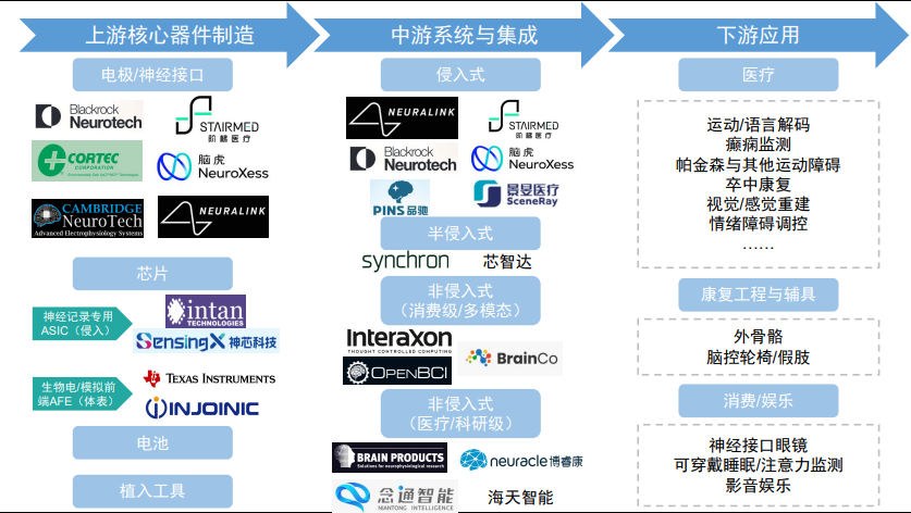 该机构进一步建议,聚焦产业链核心环节与技术路线,优先选择具备壁垒的标的。上游可关注脑电 传感器 、核心芯片等硬件供应商,受益于设备量产带来的放量需求;中游重点布局拥有核心专利与临床资源的企业,尤其是侵入式领域技术对标国际、非侵入式场景落地快的龙头;下游可跟踪在康复医疗、工业控制等细分场景形成商业化闭环的标的,同时关注“AI+脑机”“ 机器人 +脑机”的生态协同机会。
