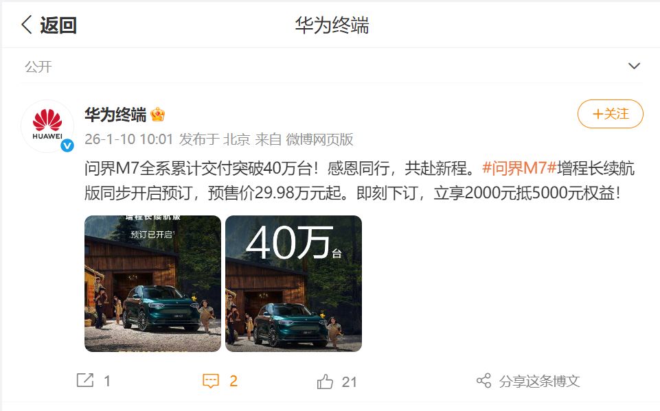 据华为终端官方微博1月10日消息,问界M7全系累计交付突破40万台!问界M7增程长续航版同步开启预订,预售价29.98万元起。即刻下订,立享2000元抵5000元权益!