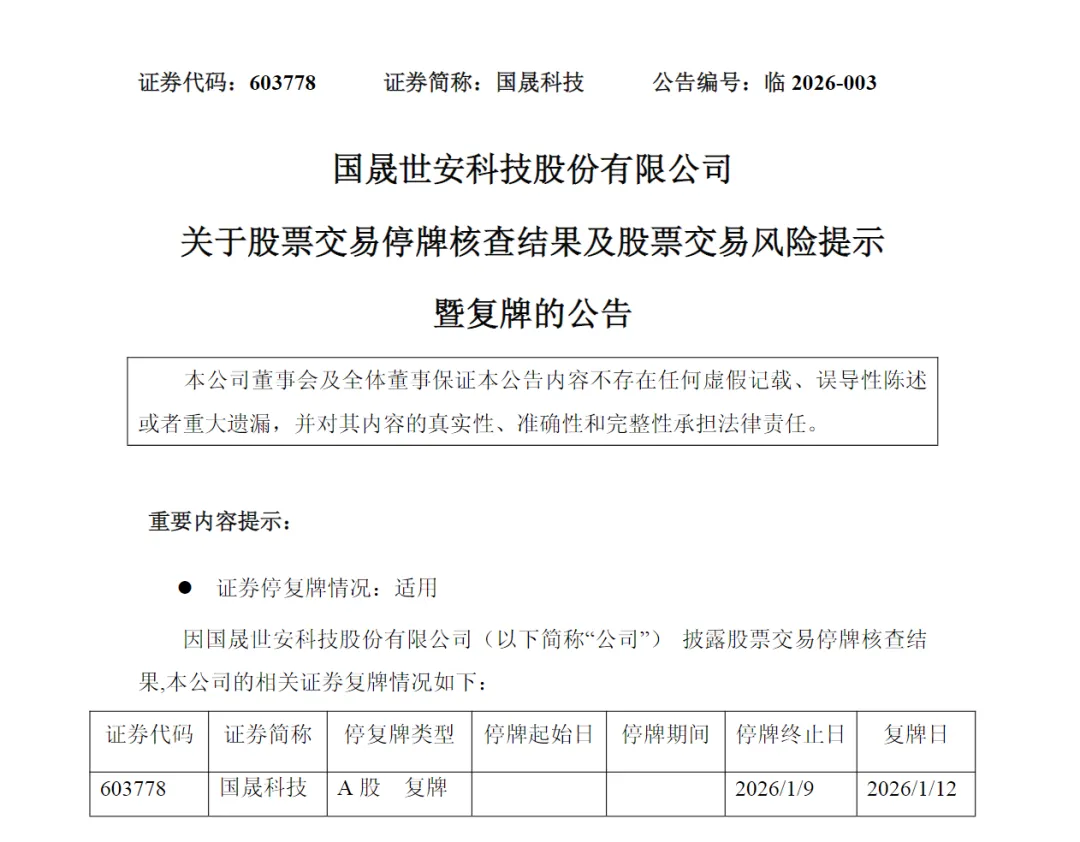 国晟科技 (603778)于1月9日晚间披露股票交易停牌核查结果,提示多项风险,并预告2025年年度经营业绩将出现亏损。公司股票将于2026年1月12日开市起复牌。