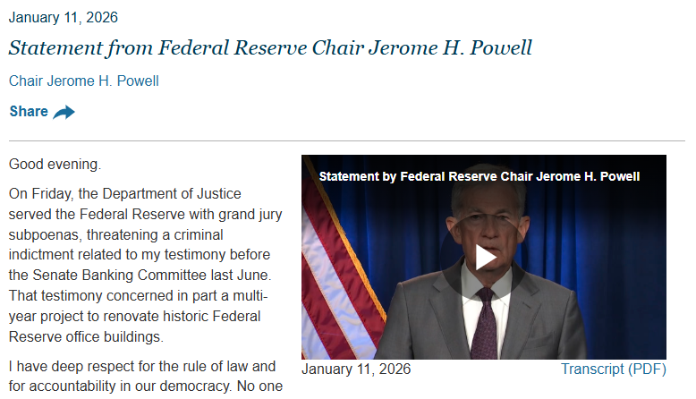 “我深切尊重法治和我们民主制度中的问责制。没有人——当然也包括美联储主席——可以凌驾于法律之上。但这一史无前例的行动,应该放在行政当局的威胁和持续施压这一更广泛的背景下来看待。”