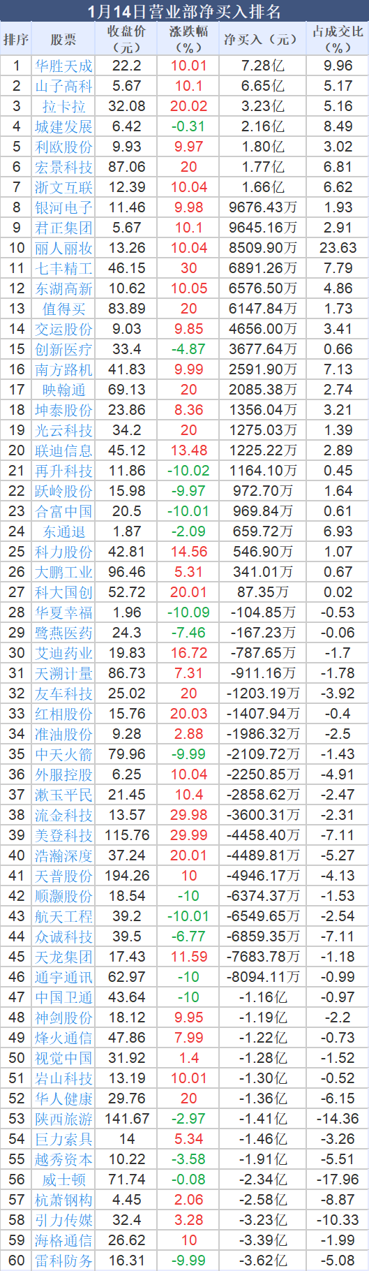 1月14日, 大智慧 数据中心显示,龙虎榜中营业部净卖出2.68亿元。其中,净买入的个股27只,营业部净买入较多个股分别是 华胜天成 、 山子高科 、 拉卡拉 等,净买入金额占当日成交额比例达9.96%、5.17%、5.16%。