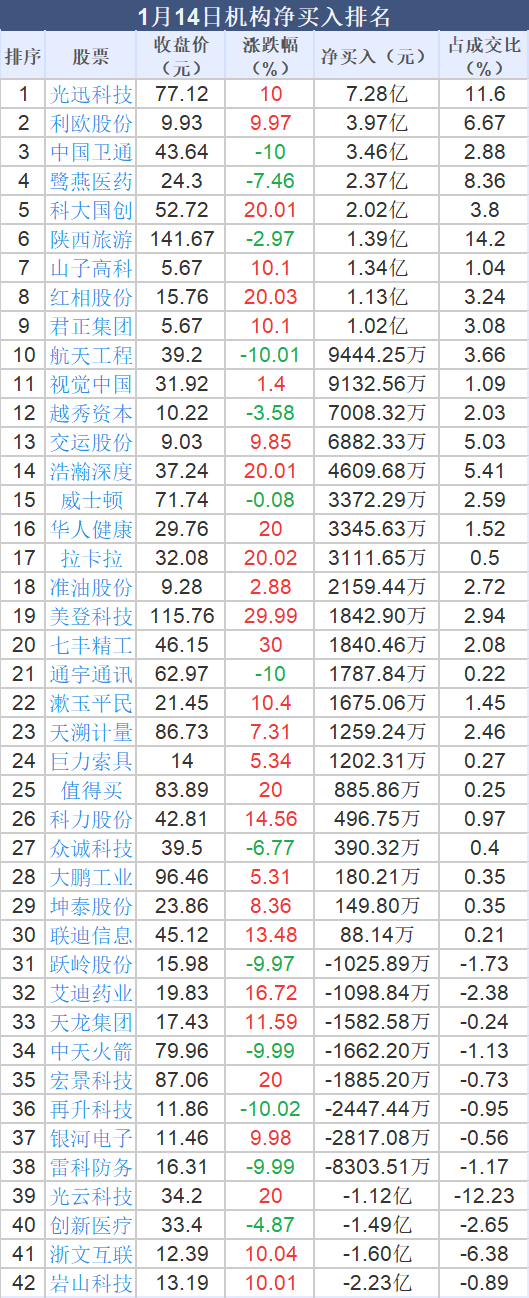 龙虎榜中机构净买入21.56亿元。其中,净买入的个股30只,机构净买入较多个股分别是 光迅科技 、 利欧股份 、 中国卫通 等,净买入金额占当日成交额比例达11.60%、6.67%、2.88%。