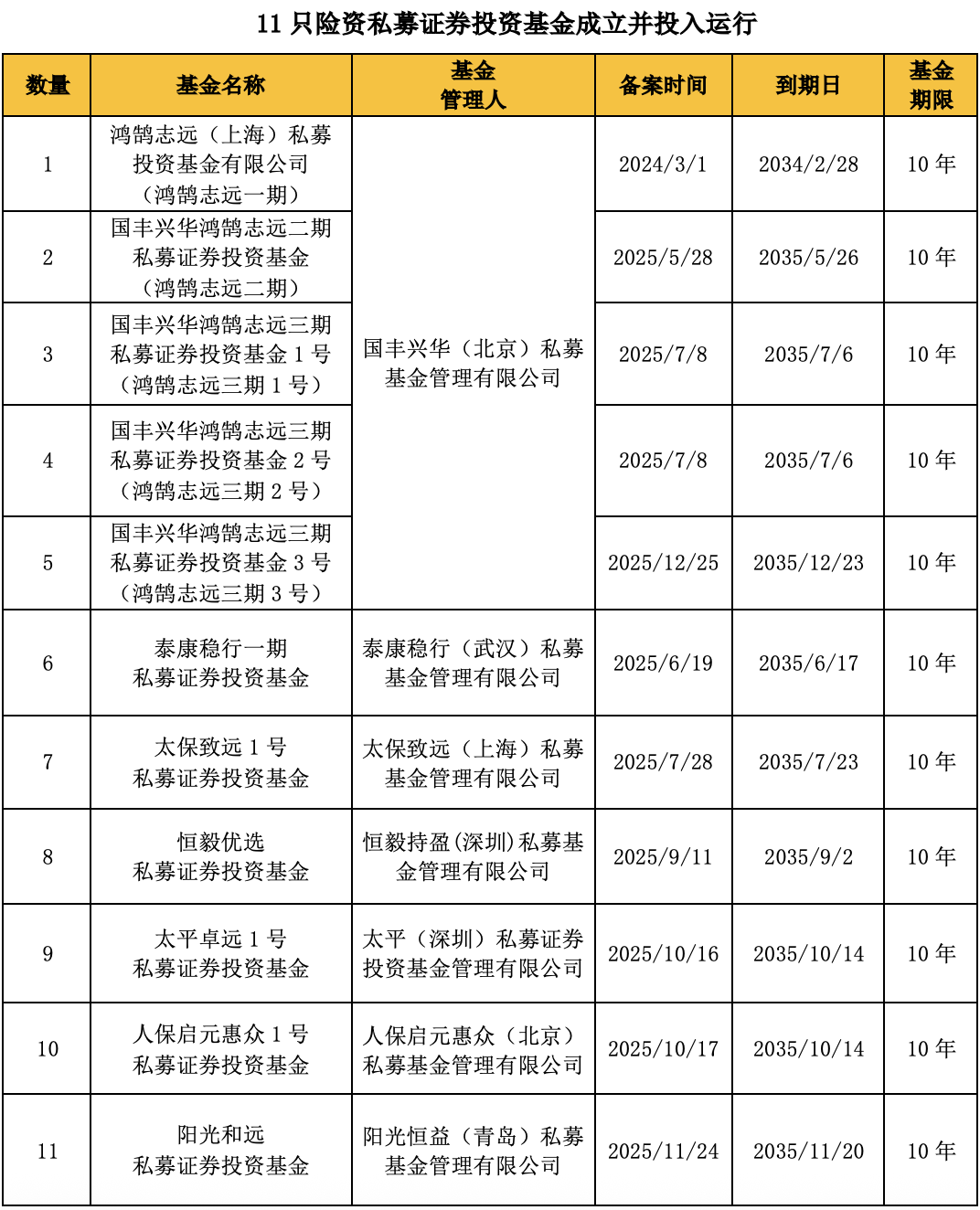 随着鸿鹄基金三期3号成立,迄今已有7家保险系私募基金管理公司成立,共发起设立私募证券投资基金已达11只。这11只基金除了国丰兴华管理的鸿鹄基金系列一期、二期、三期1号、三期2号、三期3号5只基金之外,还包括泰康稳行一期基金、太保致远1号基金、恒毅优选基金、太平卓远1号基金、人保启元惠众1号、阳光和远6只基金。据财联社记者从太平资产、泰康资产、阳光资产等多家险资了解到,目前11只基金均已投入运行。