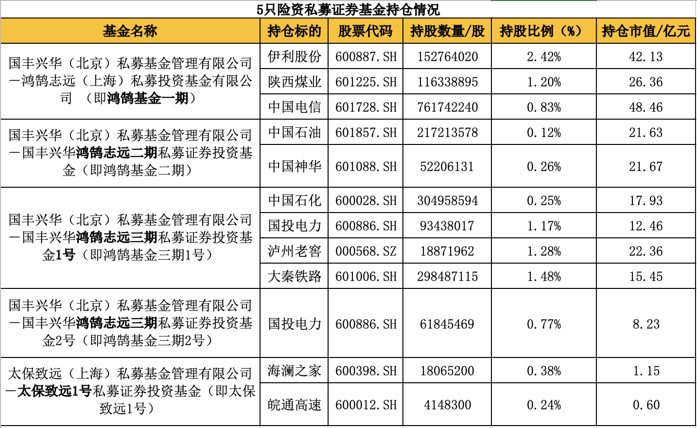 截至2025年三季度末,鸿鹄志远二期基金重仓 中国神华 和 中国石油 ,其股息率分别为7.7%和4.69%;鸿鹄志远三期1号入股 中国石化 、国投电力、 泸州老窖 和 大秦铁路 ,其股息率均在3%以上;鸿鹄志远三期2号建仓国投电力;太保致远1号入股海澜之家、皖通高速。